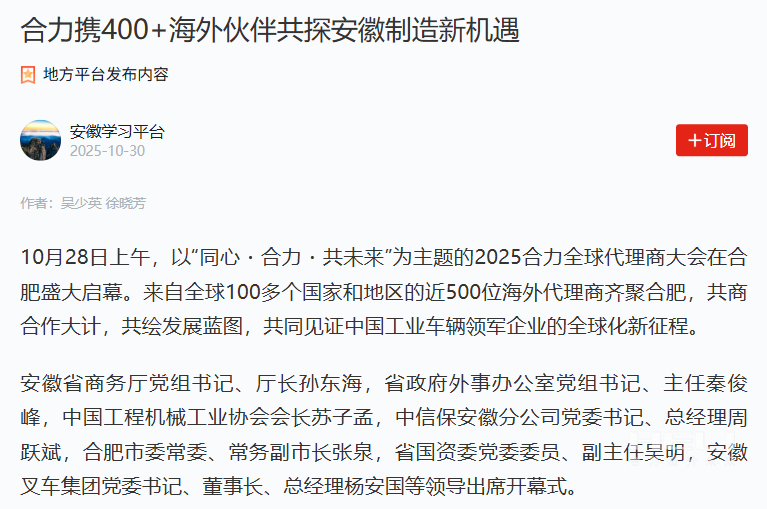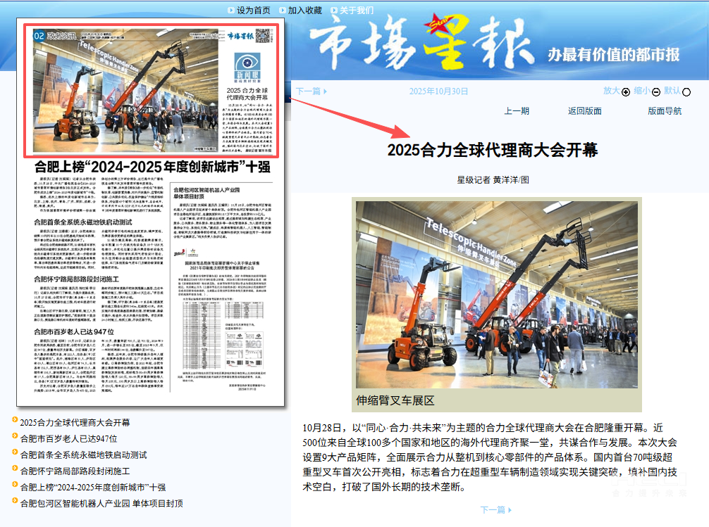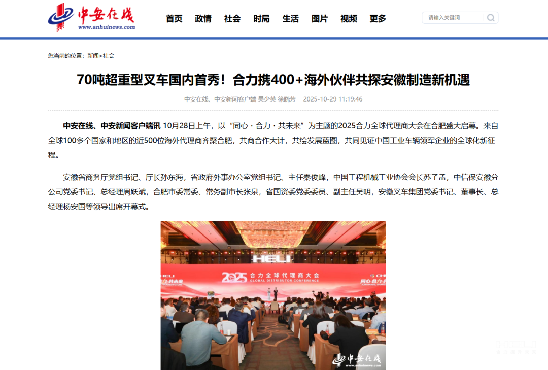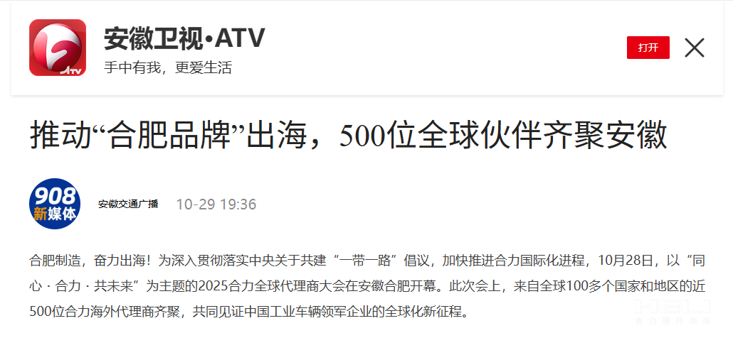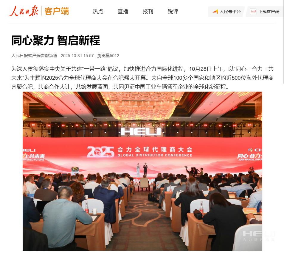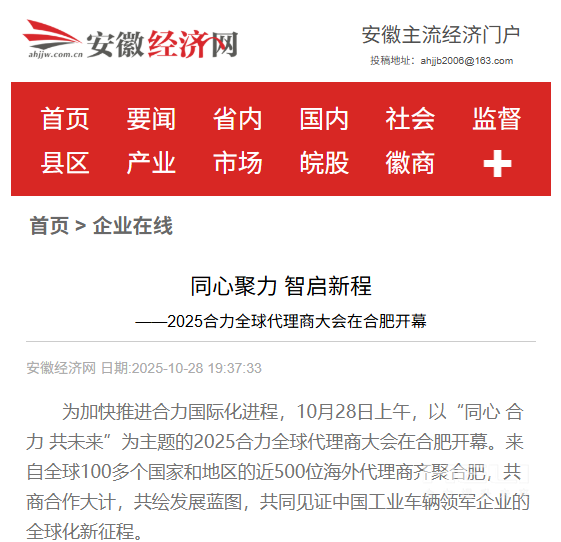 10月28日至31日,“同心?合力?共未來”2025合力全球代理商大會在合肥召開,引發媒體廣泛關注,新華社安徽分社、中央廣播電視臺安徽總站、經濟日報、證券日報、央廣網、中國工業報、人民網安徽頻道、新華網安徽頻道、安徽日報、安徽新聞聯播等28家媒體、46名記者蒞臨現場。中央、省內外及香港、行業媒體競相報道或轉載報道,內容涵蓋戰略發布、智能成果及全球化布局,形式多元、視角鮮活,立體展現合力“智能+綠色”發展新動能,奏響高質量發展強音。